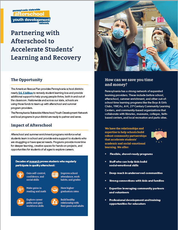The Pennsylvania Statewide Afterschool Youth Development Network (PSADYN) recently highlighted the SHINE Afterschool Program in its recent flyer. The flyer, entitled Partnering with Afterschool to Accelerate Students’ Learning and Recovery, outlines the many benefits of implementing an out of school time program. Download the flyer below or read it here.